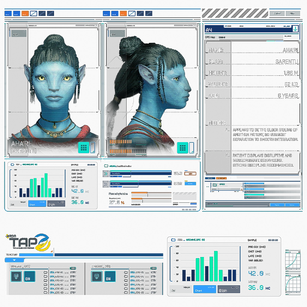 Aha'ri was the most openly rebellious of all the TAP children, displaying disruptive and insubordinate behavior to her teachers. During the lessons she hummed Sarentu's song, to which she was very attached and thanks to which she maintained the morale of the entire group. She also did not hesitate to openly confront Mercer, questioning his words about his origins. She was willing to fight to regain her freedom and identity as a Na'vi, and paid her loyalty with her life.