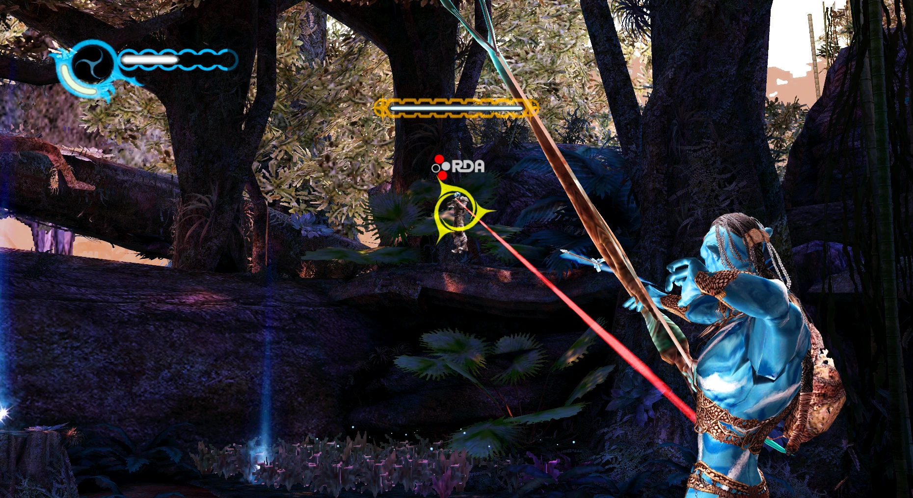 The boss fight begins with a swarm of RDA soldiers to defeat. There is also a health plant in the middle of the field which will respawn for heals. Once they are defeated, Conrad will begin sniping Rai'uk. In this part, Rai'uk must quickly take out his bow and fire at Conrad; climbing upon a stump can get a better view at him. When Conrad moves around the upper level, he may also suddenly reappear behind Rai'uk. Another swarm will begin consisting of two AMP suits.
