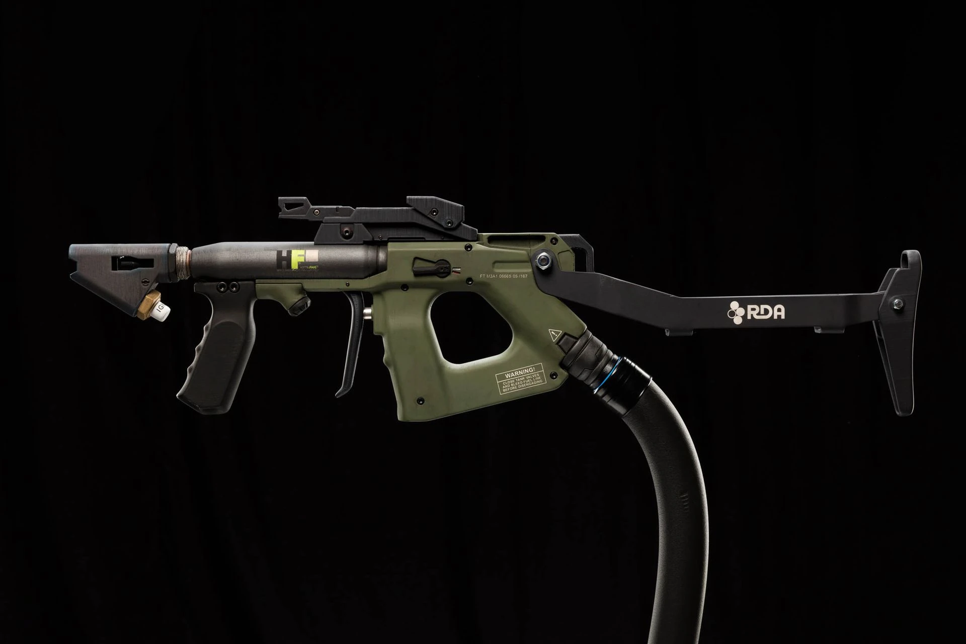 This flamethrower system is a result of years of development. Based on the older Bush Boss FD-3, the FT-M3A1 offers improvements on fuel capacity, range and mobility. The flamethrower is connected by a hose to a tank system containing fuel and a propellant.[1] It also has a collapsible stock depending on the user's preference.[1]