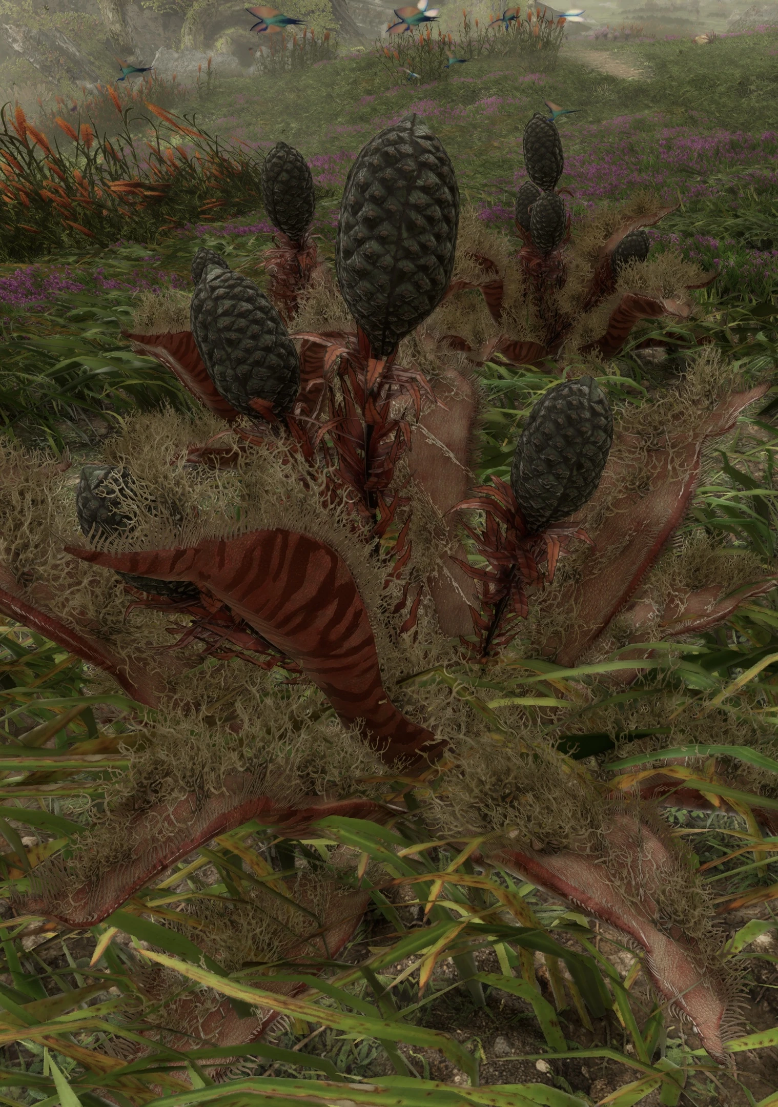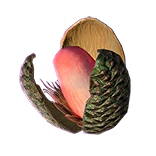 Fire seed cones are eaten by hardier creatures of the Veldt, especially the bladehead which has learned to use its armored jaw to slowly crack the volatile nut and consume the spores and oil within.