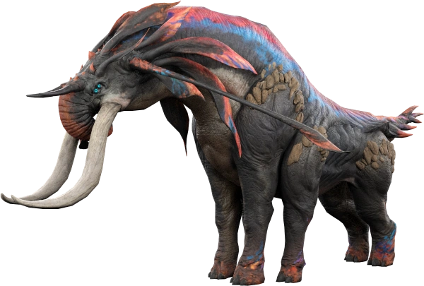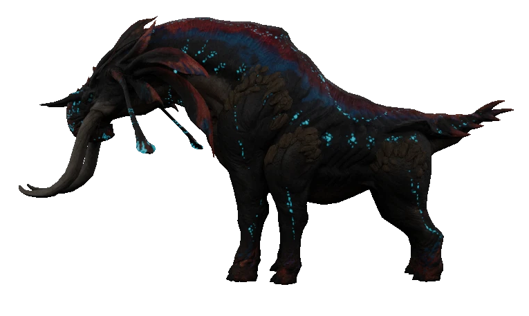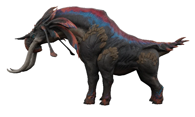 Possessing typical hexapod physiology and heavy musculature; the mastodon has a thick, patterned hide which ossifies into armored scales at the thighs and flank. Strikingly, the mastodon displays a sharp, brightly colored bone ridge that protrudes from the front of the skull, commencing at a crest which continues down the animal's spine, terminating at the tail.
