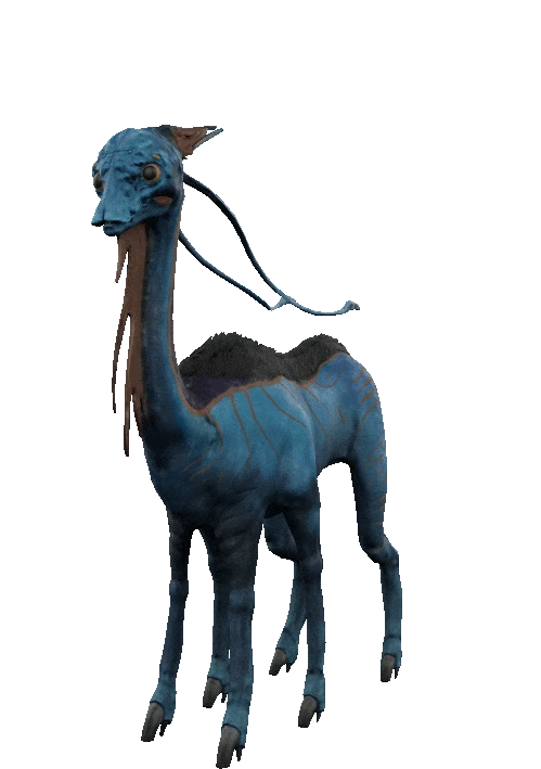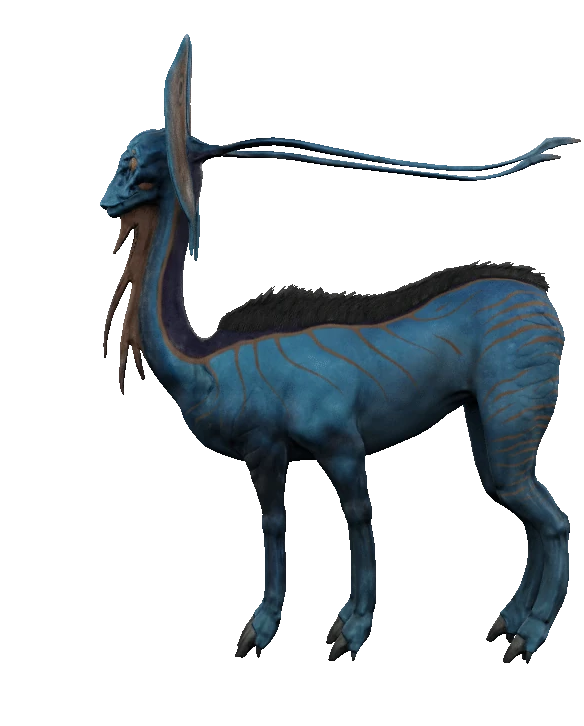The hexapede resembles a six-legged Terran gazelle or antelope. They are dark blue herbivores with white and yellow stripes.