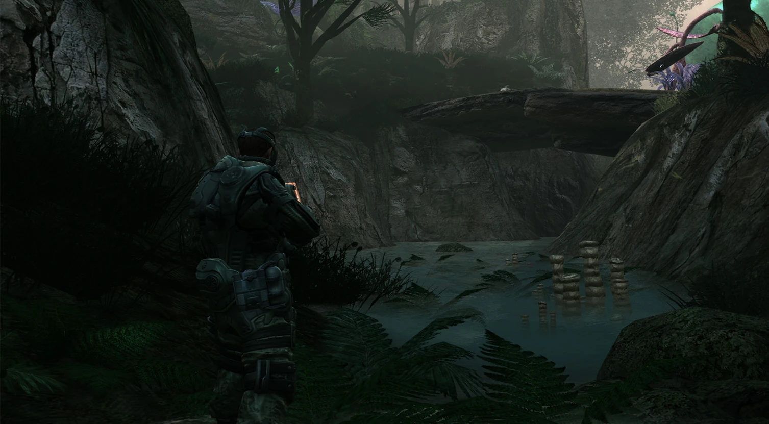 Hexapede Study is an area in the eastern edge of Grave's Bog, and is connected to Mowlaki Village in the south and Acoustics Outpost in the north. The river runs through this area, and the rocks form a natural bridge over the top of it. There is a stone jar perched on top of the bridge.