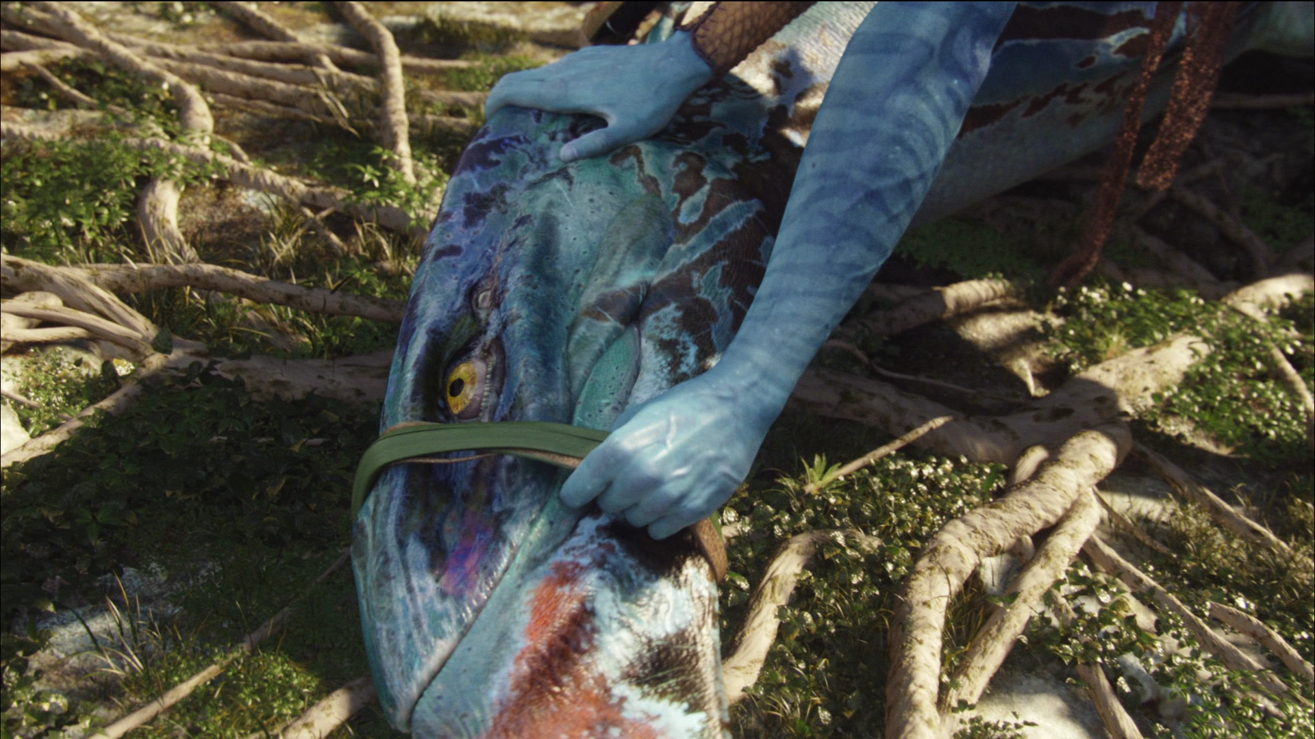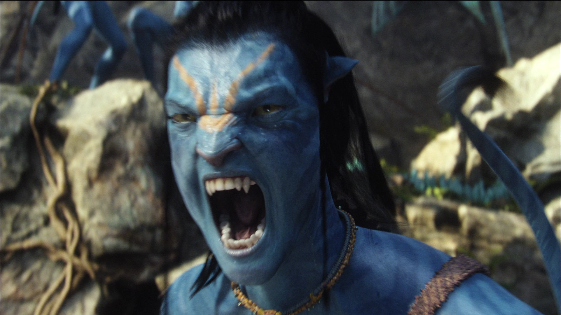3D Version: red/cyancross-eyedJake hissing at an ikran during Iknimaya.