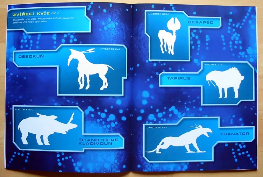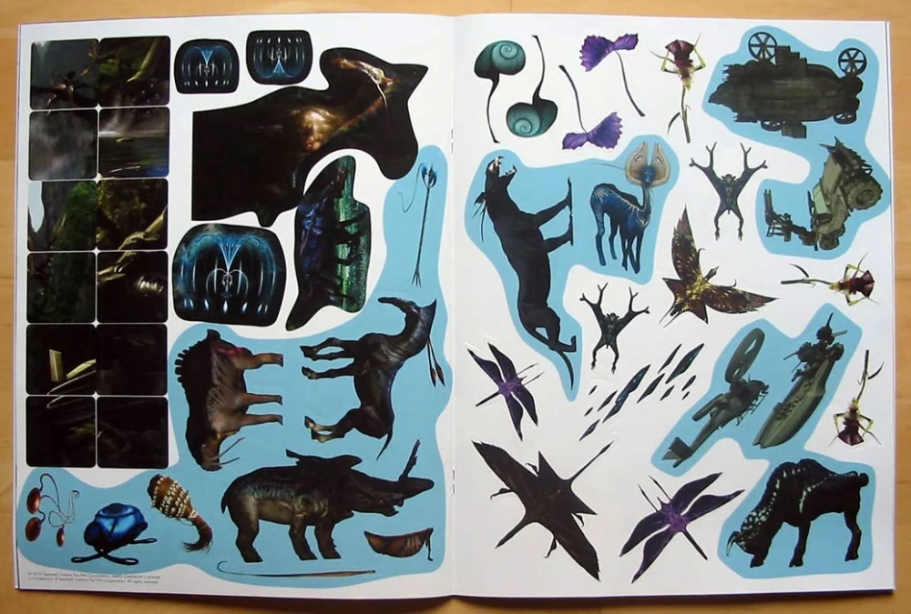 Contains 47 stickers across a two-page center spread. The stickers are comprised of Pandoran creatures, Na'vi "necessities," RDA vehicles, and square "icons" featuring Pandoran landscapes and RDA technology.