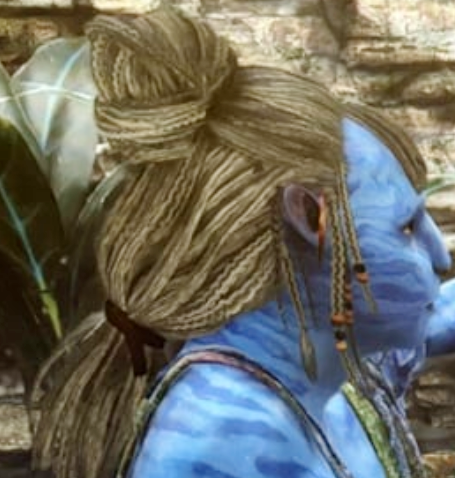 One of the most unique aspects about the Na'vi are their queues which are a long appendage ending in pinkish tendrils that look somewhat like hair but are actually extensions of their nervous system. This organ plays many key roles in Na'vi culture, allowing them to bond with animals, access the memories of their ancestors through Eywa, or bond with one another to view each other's memories.