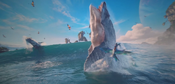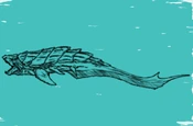 Massive and armored, with no visible dorsal fin, nalutsa have two sets of humpback whale-like shaped flippers, and a long tail ending in jagged and flared flukes. A massive but relatively short set of jaws contain sword-length teeth for rending and tearing prey, but its head is relatively small compared to its total body length. With a plated exoskeleton - a nalutsa’s body is not dissimilar to the shell of a turtle.