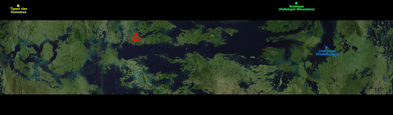 A portion of Pandora (only the equator) extracted from the Wii game with approximate locations of notable locations