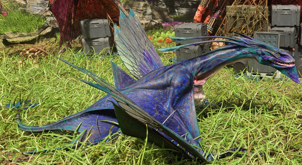 The ikran is mostly purple in color with light and dark blue stripes and does not appear to wear any gear.