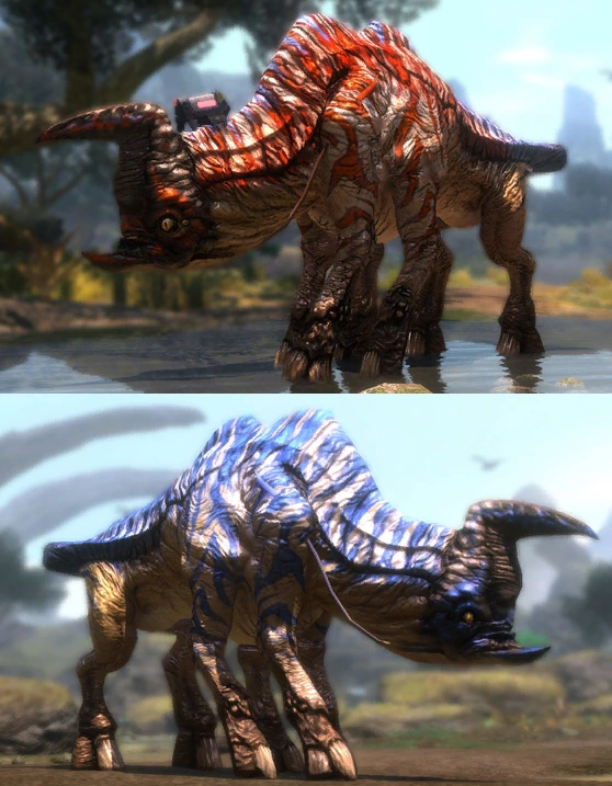 The male (or 'bull') is about 15 percent larger than the female (or 'cow'), has a larger ridge bone on its back, and also has a dramatic top horn that is used for defense against and contest with other bulls. Avatar: The Game suggests that male sturmbeest have stripes which are primarily red with some faint blue near their backs, while the female sturmbeest have entirely blue stripes.