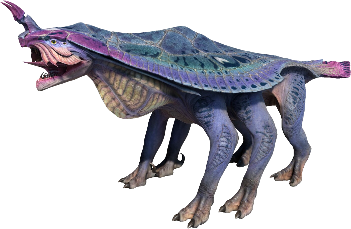 Hunting in small packs of up to five individuals, the whipfang crawler can also use its strong jaws to attack, while remaining protected by the plates that run all along the top of its body. It is capable of advanced pack tactics, communicating with vocalizations and pheromones, which enables a group of whipfang crawlers to face off against larger threats such as the Thanator.