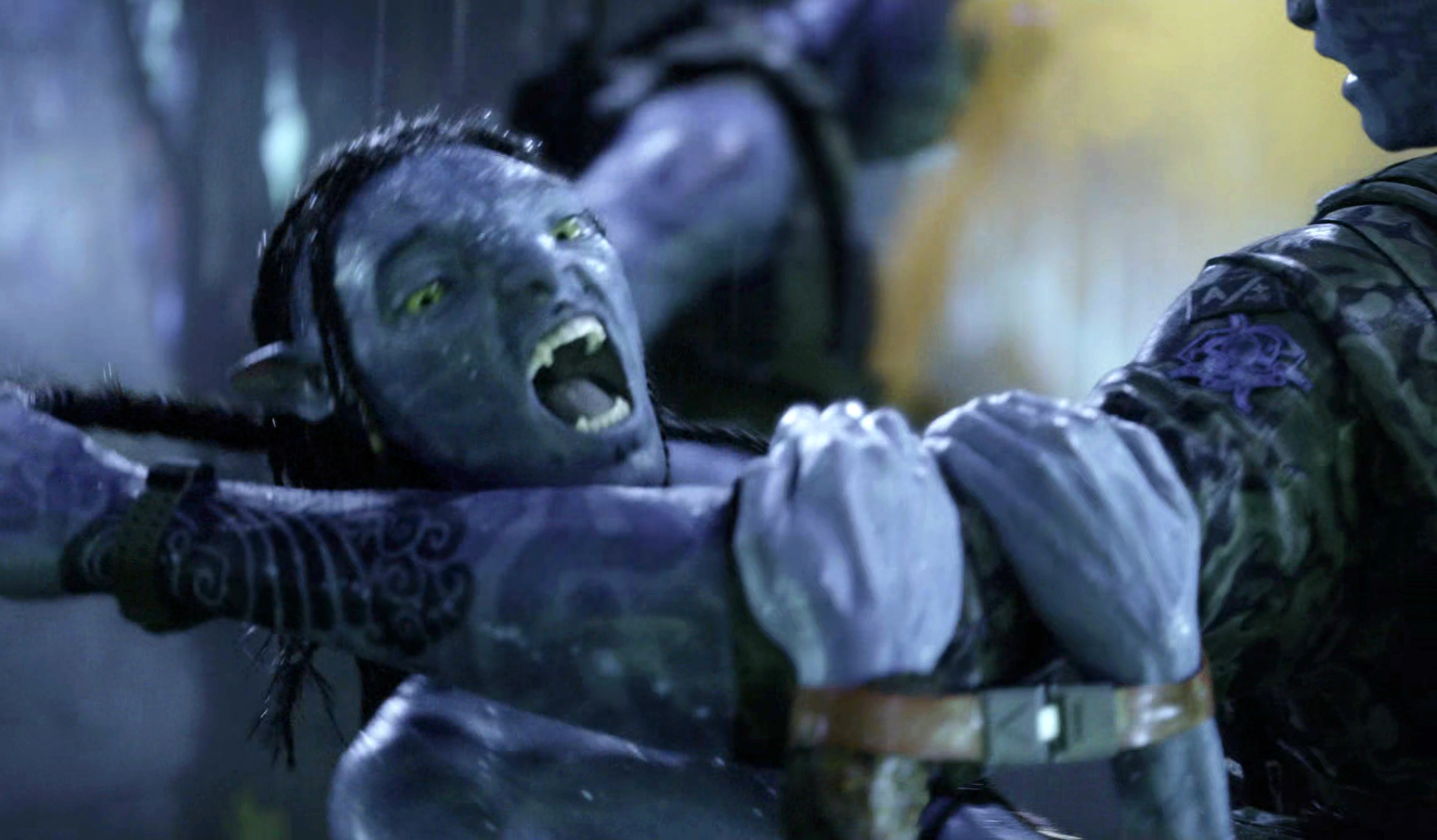 Lo'ak about to chomp Zhang's arm.